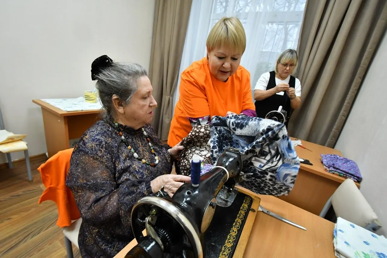 В швейной мастерской каждый может обучиться созданию и ремонту одежды. Там установили машинки и раскройный стол. Пожилые "творят с душой и пользой": шьют нижнее белье и вяжут носки для бойцов специальной военной операции. За работой поют русские народные песни.