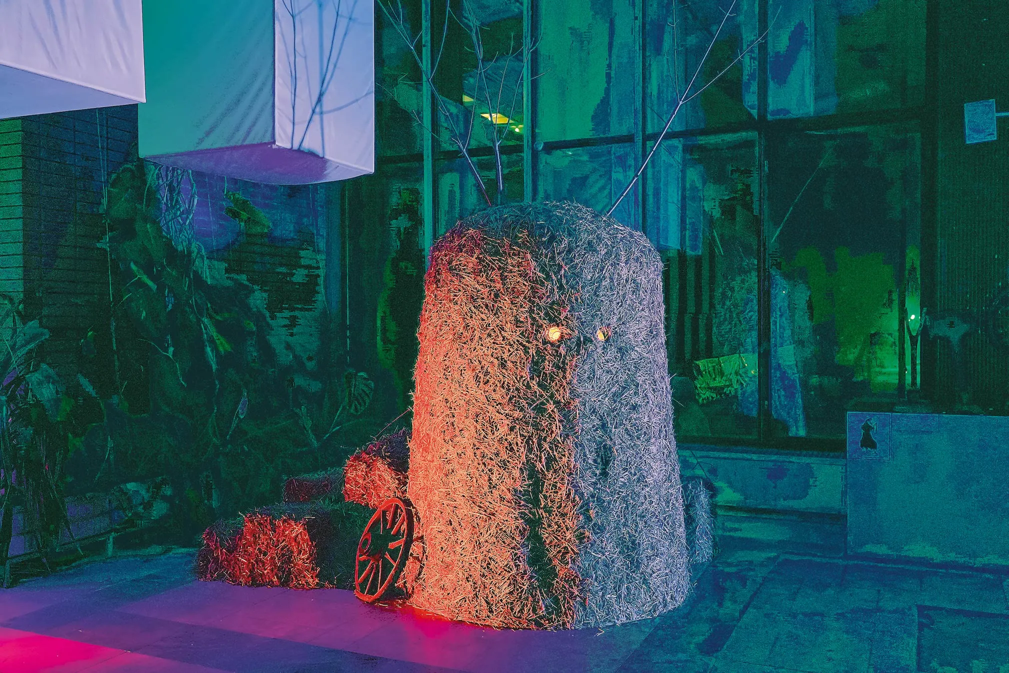 Татарский Албасты, например, прятался в заброшенных домах и на перекрестках дорог. На выставке его изобразили в виде стога сена с горящими красными глазами. Это только одно из его физических воплощений, иногда он являлся в образе человека. Согласно быличкам, путники, которые возвращались домой в предрассветное время, видели движущиеся за ними стога сена. Люди верили, что таким образом их преследуют злые духи. Спасало путешественников пение петуха. Эта птица с давних времен является символом добра и света.