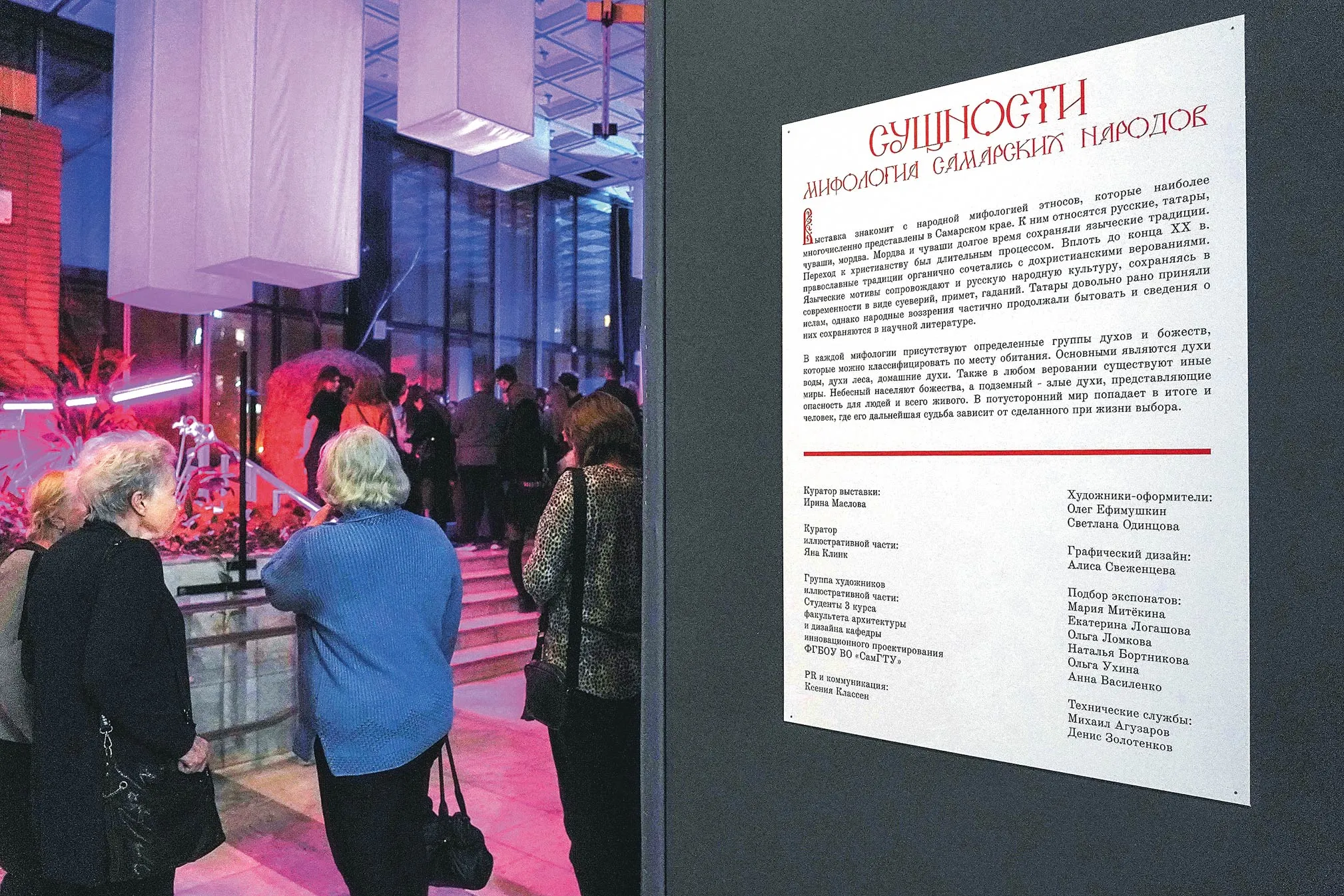 Новый проект музея знакомит с историей и обычаями жителей Поволжья. Экспозицию дополняют работы студентов факультета архитектуры и дизайна Самарского государственного технического университета под кураторством дизайнера Яны Клинк, а также произведения местного художника Олега Ефимушкина. Молодые авторы вдохновились легендами самых многочисленных народов региона и создали иллюстрации с образами духов и мистических существ. Есть тут и татарская повелительница воды Су Анасы, и мордовская хозяйка леса Вирь-ава, и верховное божество чувашей Султи Тура.