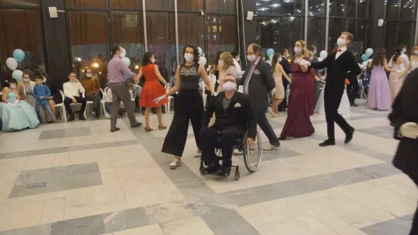 В Самаре состоялся инклюзивный бал. Дамы и кавалеры, которые, несмотря на ограничения по здоровью. любят танцевать, показали фигуры из программы балов от 19 до 21 века. Над постановкой работали хореографы и волонтеры. Именно они составили пару главным героям торжества.