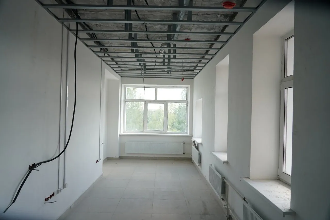 Работы по реконструкции объекта вышли на финишную прямую. Полностью заменена кровля, подведено электричество, внутренняя развязка инженерных коммуникаций. Завершился монтаж приточно-вытяжной вентиляции, которая будет на каждом этаже и в некоторых кабинетах, как это и предусмотрено нормативами. К зданию подведена вода, канализационная и отопительная системы. На всех этажах произведено расширение и укрепление лестничных маршей, на полу выложена плитка. На первом этаже уже видны очертания будущей регистратуры – стены окрашены в оранжевый, желтый и зеленый цвета.