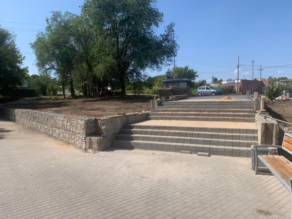 На данный момент завершен монтаж габионных конструкций (они представляют собой контейнеры из сетки, заполненные камнями), заканчиваются работы по укладке тротуарной плитки на ступеньках, проложен тротуар, устанавливаются бордюры, подготавливается основание для детской площадки.