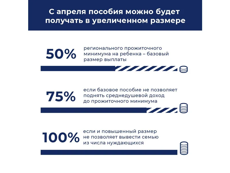 Основные принципы начисления выплат уже обнародованы. Так, с 1 апреля, согласно указу Президента РФ, размер пособия будет меняться в зависимости от доходов семьи и объемов имеющегося у нее имущества. Если раньше все категории заявителей получали 50 % от регионального прожиточного минимума на детей, то теперь семья может получить 75 и даже 100 % - если минимальной выплаты недостаточно, чтобы вывести ее из категории нуждаемости.