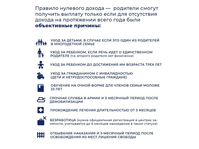 При этом вводится понятие "нулевого дохода". Если у члена семьи есть веская причина для отсутствия дохода, он также может рассчитывать на детские выплаты. Под причиной понимается уход за ребенком до 3 лет, уход за ребенком в многодетной семье, уход за гражданином с инвалидностью, прохождение срочной службы в армии, безработица и т.д. А для безработных необходима официальная регистрация в центрах занятости: в этом статусе можно находиться до 6 месяцев.