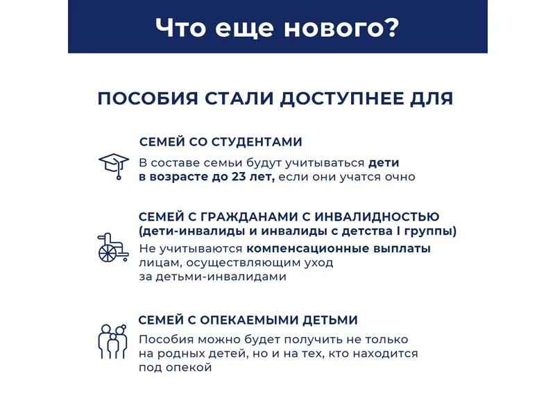При этом некоторым категориям граждан получить выплаты будет проще. Так, детское пособие теперь начисляется не только на родного, но и на приемного ребенка. При этом в доходе семьи не учитываются выплаты по уходу за ребенком-инвалидом или инвалидом с детства I группы. В состав семьи теперь будут включены студенты до 23 лет, если они занимаются очно.