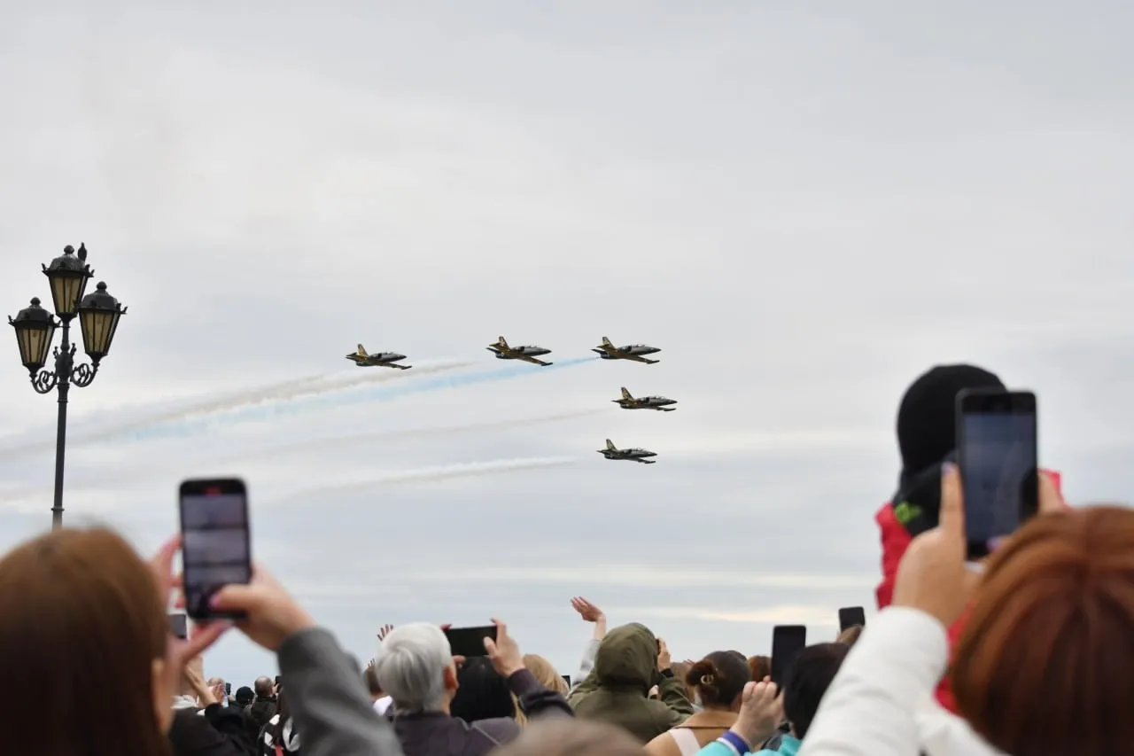 Кульминацией мероприятия стало зрелищное выступление пилотажной группы "Русь". 5 самолетов Л-39 показывали различные маневры и фигуры с цветовым сопровождением.