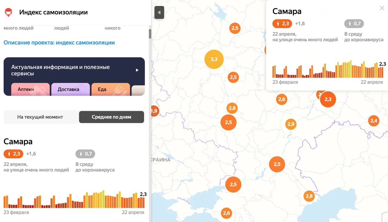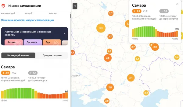 По информации Яндекса, сегодня, 23 апреля, индекс самоизоляции Самары достиг самой низкой отметки за всё время наблюдений. На 12:00 сервис показывал 1,9 балла. Такие нехорошие показатели город демонстрировал только на прошедшей неделе, 13 и 14 апреля. Повышению индекса не способствовало ни похолодание, ни даже внезапно налетевшая снежная буря.