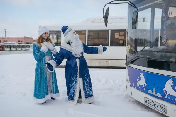 В Самаре в среду, 30 декабря, вышел на линию необычный автобус. Пассажиров в нем привечают Дед Мороз и Снегурочка.