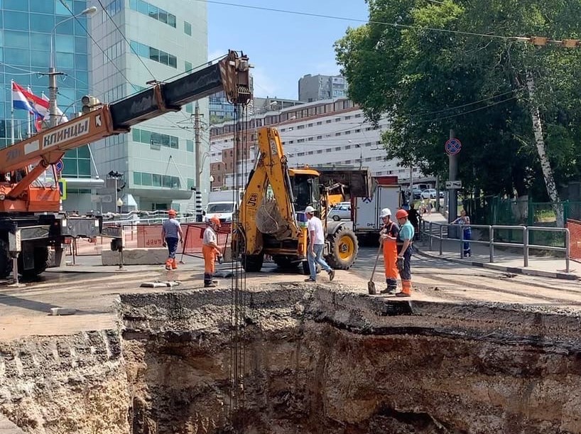 Напомним, на Волжском проспекте в районе дома № 49 специалисты больше недели перекладывали трубы канализации и строили колодцы на глубине около 8 метров. К вечеру 14 июля завершили работы и передали подрядчику для засыпки котлована и восстановления дорожного покрытия. С четверга на пятницу дорожники, засыпая землю в яму, повредили трубы и колодец.