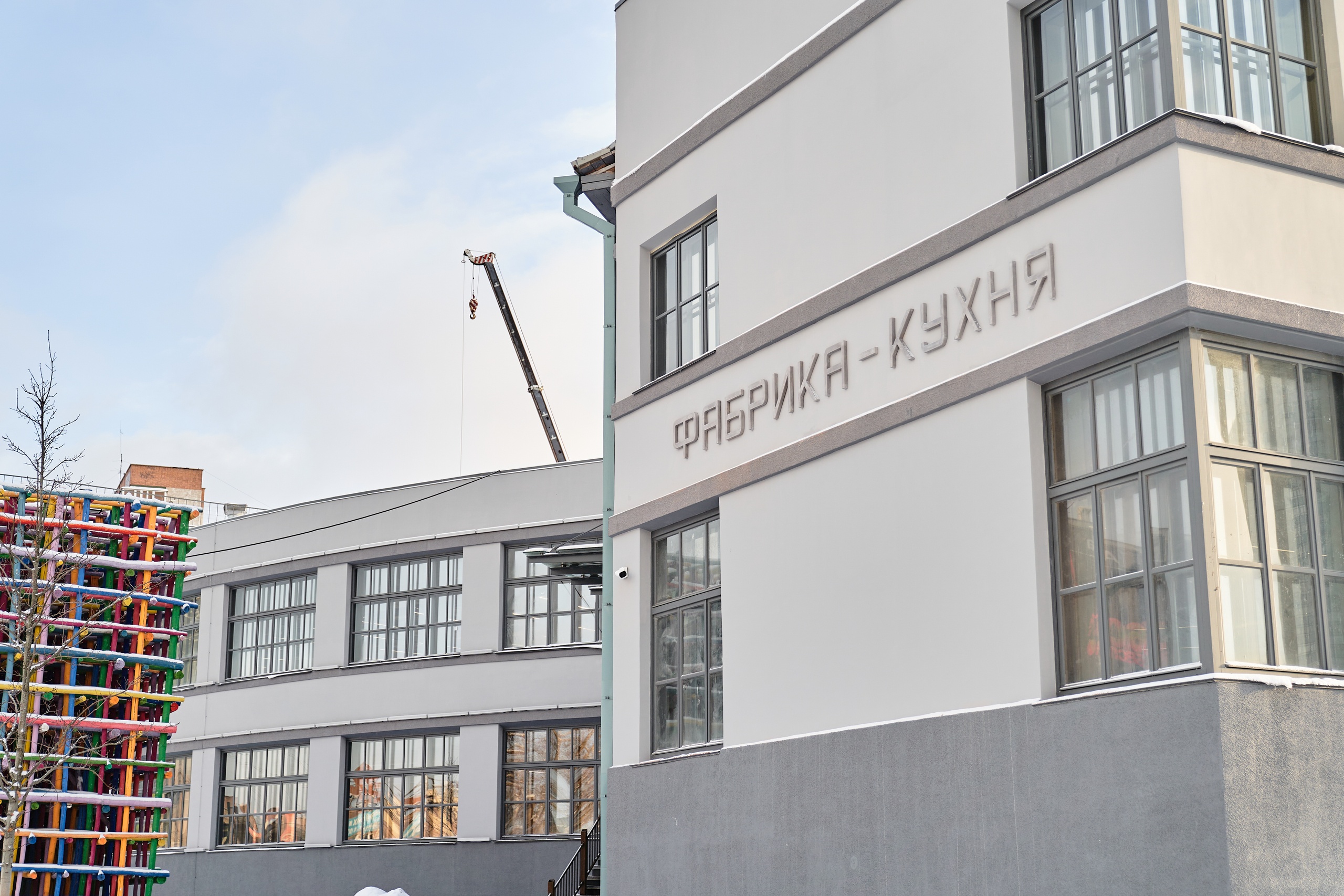Монтажные работы по установке надписи "Фабрика-кухня" начались во вторник, 26 декабря. Спустя три дня они были завершены. Буквы выполнены в аутентичном стиле и гармонируют с внешним обликом здания.