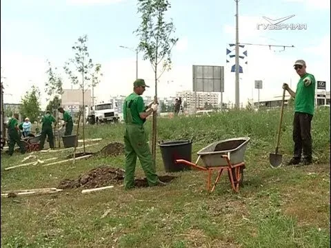 Две недели на возведение коридора. Новые деревья сейчас активно высаживают в районе "Самолёта", пересечении с проспектом Кирова. Замена туям - рябина. Жара - работам не помеха.