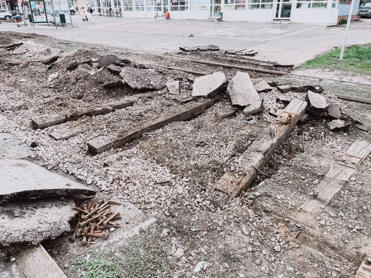 А в настоящее время обновляют трамвайные пути в местах примыкания к дорогам.