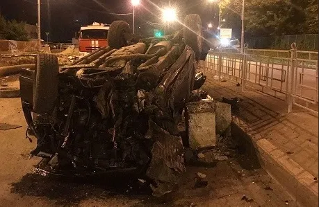 После столкновения с блоком машина наехала на бордюрный камень и перевернулась на крышу. Водитель и 38-летний пассажир были доставлены в больницу и госпитализированы.