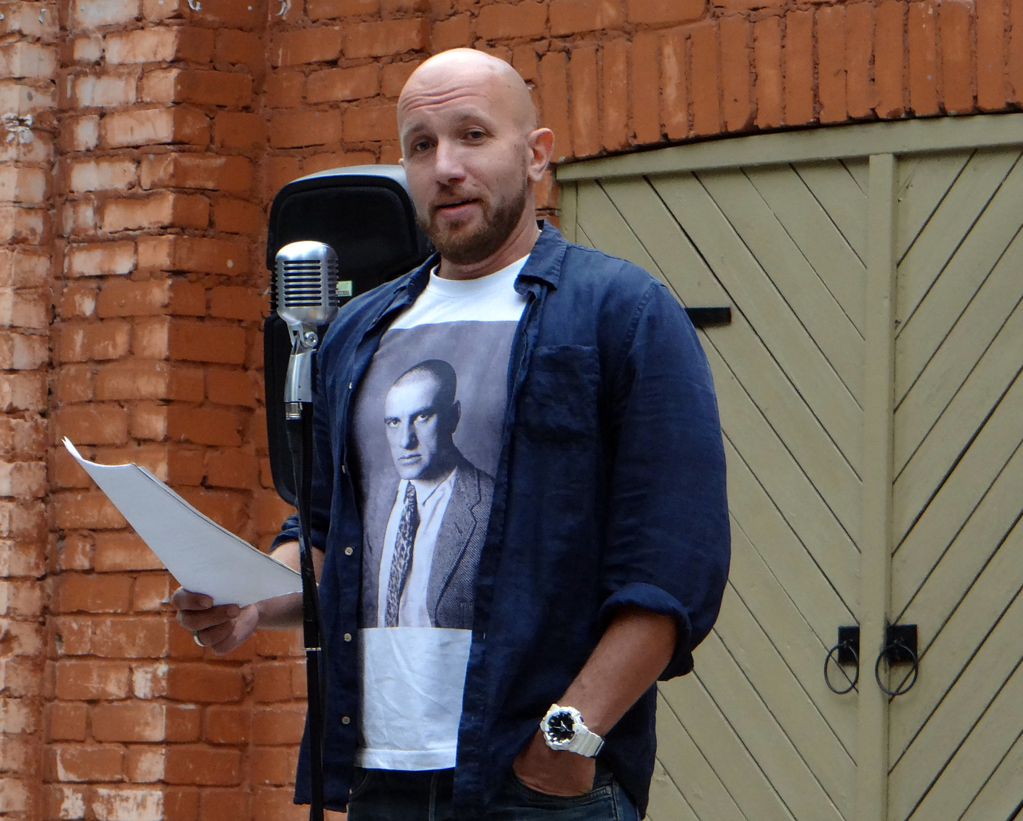 "Зал Губкома переполнен. На эстраде громадный Маяковский. Голосищем своим, рожденным, чтобы перекликиваться с громами, он бросает в зал слова вступительного доклада. Каждое слово, как громыхающий поезд, наезжает на толпу. Большие красные руки взмахивают, мнут воздух пальцами, похлопывают, поглаживают слова, как печник мокрую глину. Маяковский говорит о "лице левой литературы"… Стихи свои читает Маяковский мастерски. Без тени актерства, с мощной простотой, углубляя и слегка растягивая ударные слова встряхивающим стены неиссякаемым своим голосом".