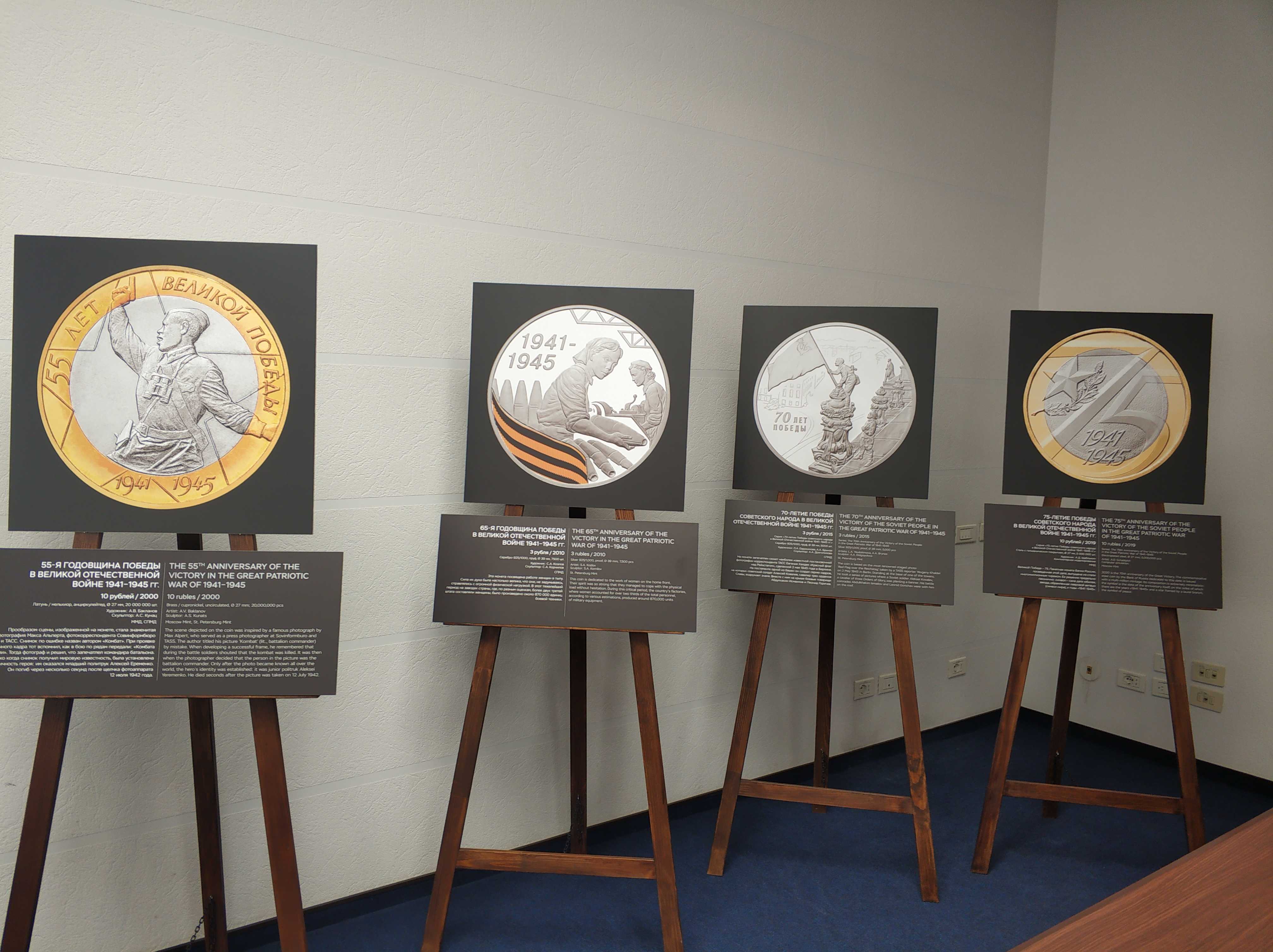 Например, на выставке можно будет увидеть 10-рублевую монету в честь 55-летия Победы, на которой воспроизведен фрагмент легендарной фотографии комбата. Командир с пистолетом в руке, поднимающий солдат в атаку, стал для всего мира символом отваги и мужества. Также на монетах запечатлен подвиг тружеников тыла, обеспечивавших фронт всем необходимым.