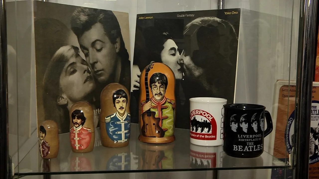 Основу выставки составляют вещи из частных коллекций. К примеру, легендарная "четверка" из Ливерпуля на матрешках. Каждая - точная копия музыкантов Джона Леннона, Ринго Старра, Пола Маккартни и Джорджа Харрисона.