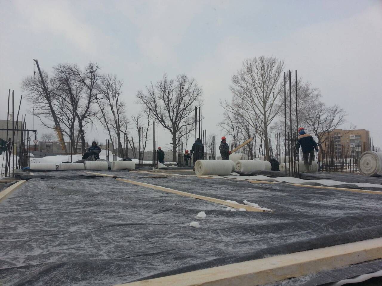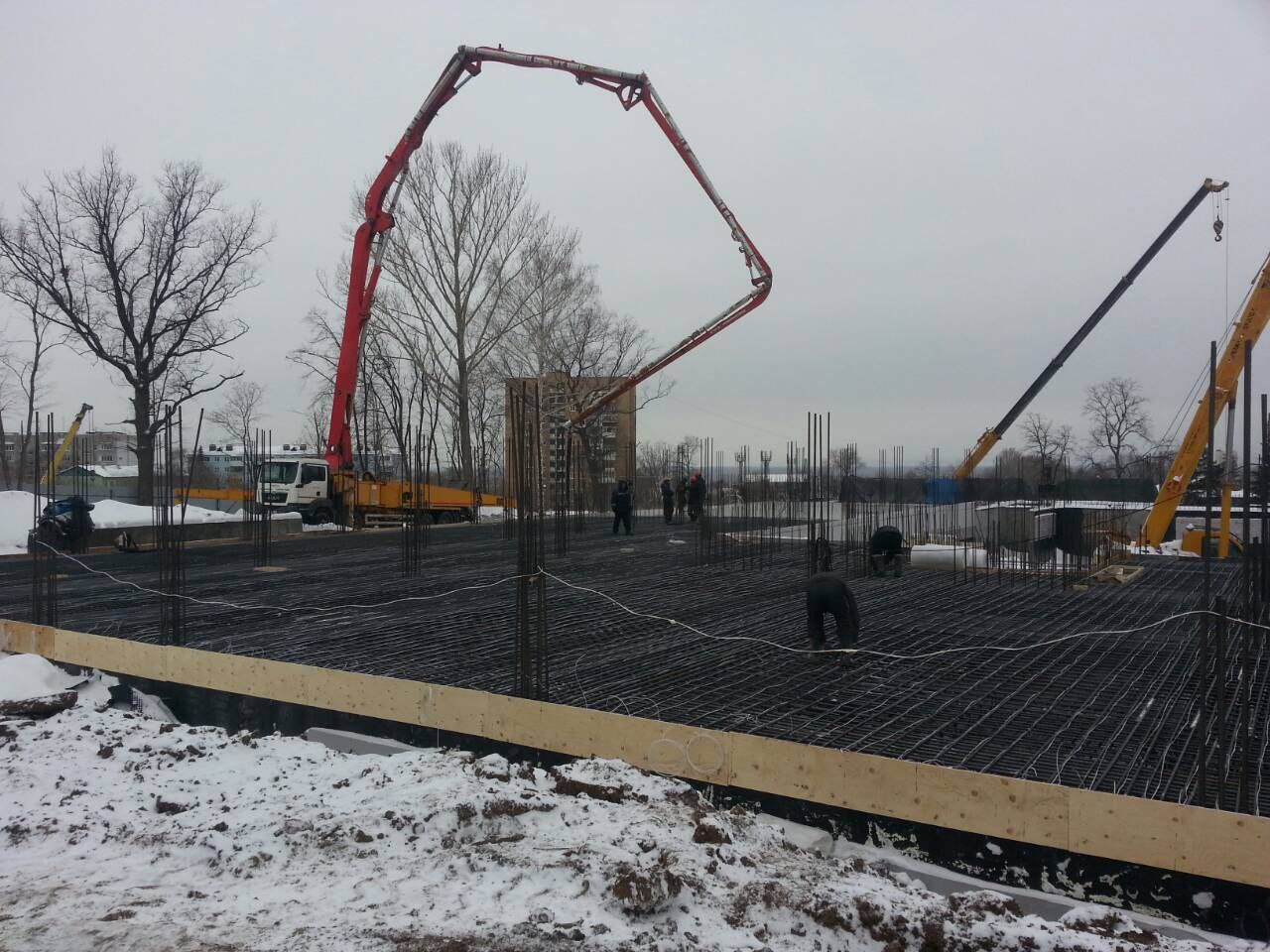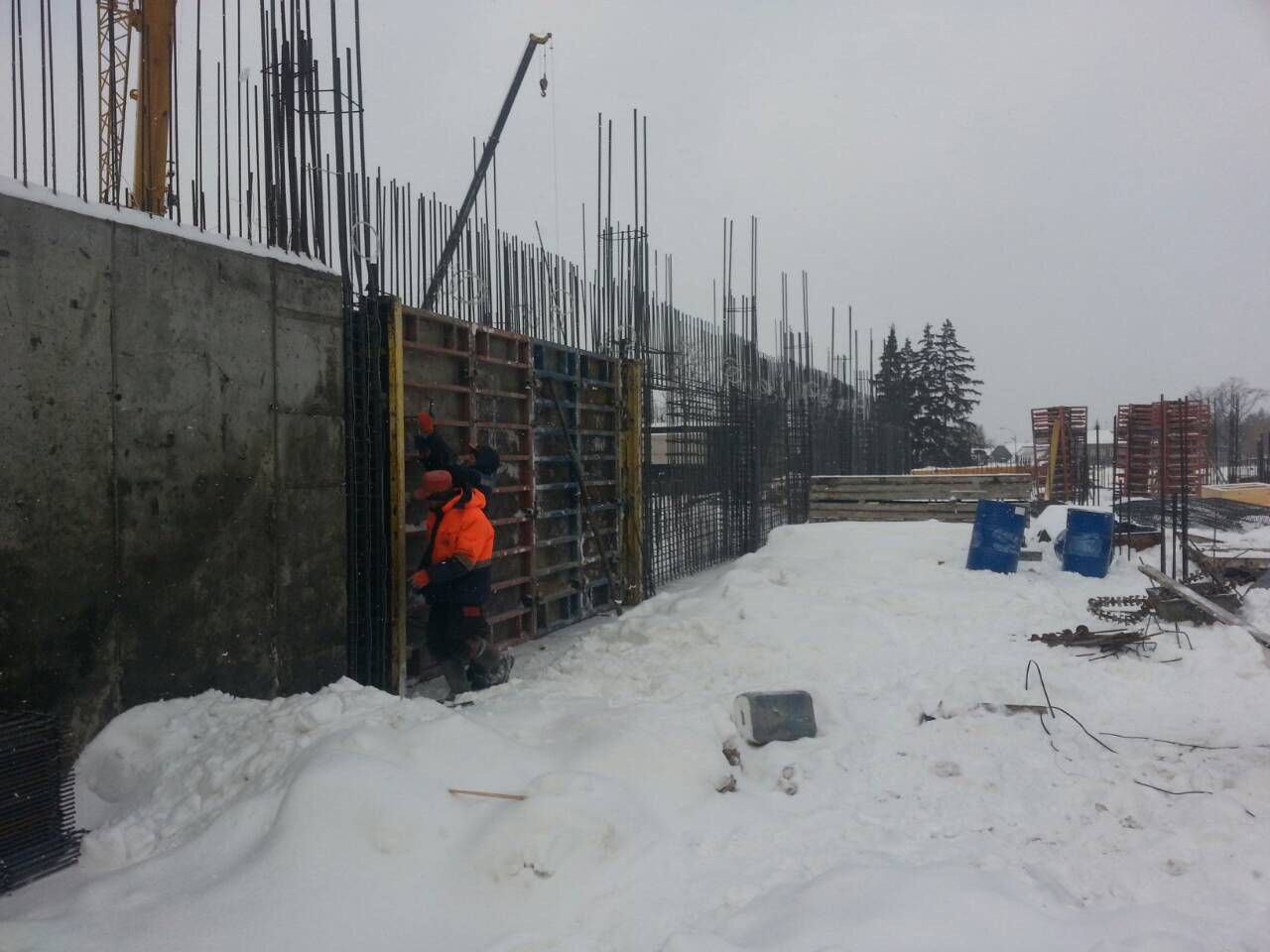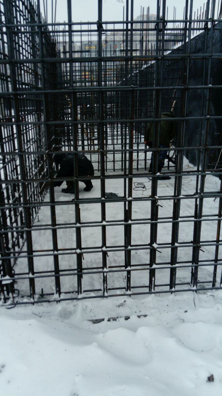 Сейчас закончены все подготовительные работы, подрядчик приступил к строительно-монтажным (в подвале). В частности, идет устройство фундаментных плит, установка монолитных стен подвала, гидроизоляция наружных стен и фундамента. Периметр здания поделен на пять блоков, на каждом из которых проводятся свои виды работ. На объекте трудятся 60 человек в 2 смены.