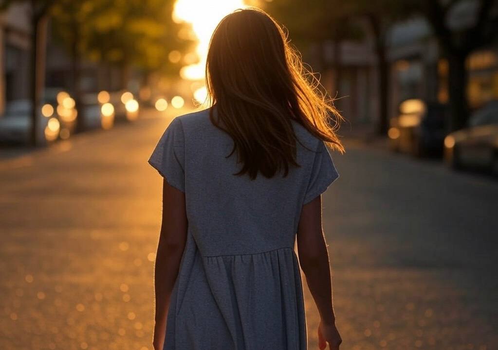 В тот день на ней были серая кофта, голубые джинсы и фиолетовые кроссовки.