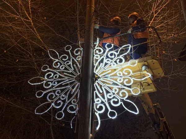 Накануне вечером, 24 ноября, там начали монтировать светящиеся снежинки. Всего на опорах повесили семь консолей. Как отмечают в подрядной организации, закрепили их надежно.