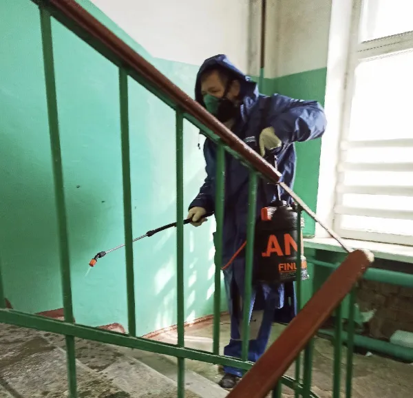 В областном центре в усиленном режиме продолжают дезинфицировать подъезды жилых домов по всему городу.