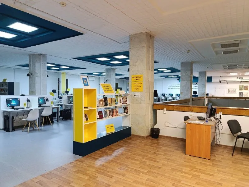 А на втором - зона книговыдачи, коворкинг, компьютерный класс, студия звукозаписи, выставочная зона, конференц-зал, мастерские и кинотеатр. Общая площадь составляет около 950 квадратных метров.