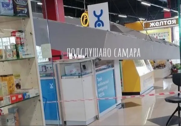 - В ТЦ "Миндаль" упала эта штука на островки и задела мужчину. Он сидит на стульчике и ему оказывают первую помощь.