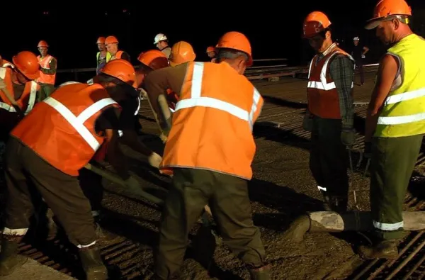 Заливка раствором шла всю ночь. Всего на бетонные работы израсходованы 4,5 тысячи кубометров материала, уложено более двух тысяч тонн арматуры и 9 тысяч тонн других металлоконструкций. На мосту будет шесть полос движения, по краю - шириной 4 метра, в центре - по 3,5 метра.