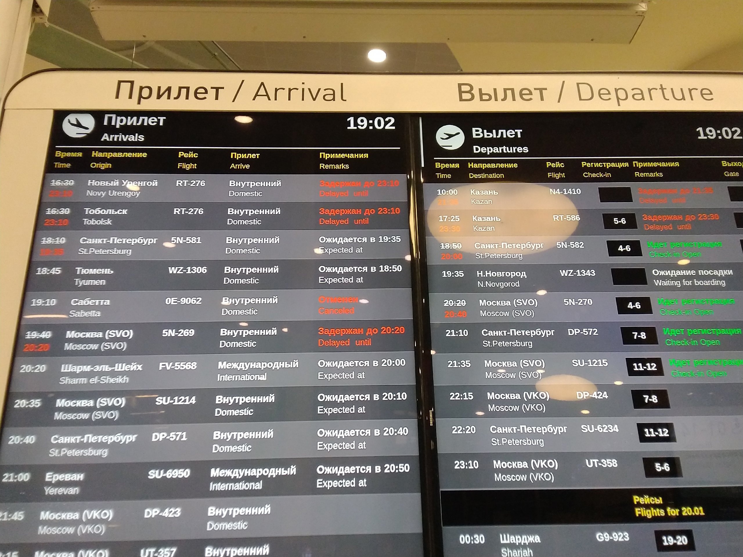 Информацию подтверждает и онлайн-табло аэропорта. Самолет, который должен был вылететь в Казань в 10:00 19 января, отправится только в 9:10 20 января. Еще один рейс, назначенный на 17:25, перенесен на 23:50.