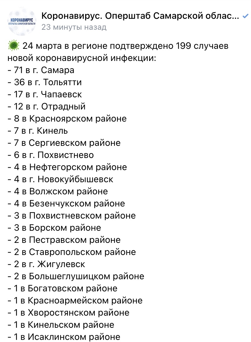 Больше всего заражённых найдено в Самаре (71), наименьшее количество - в Богатовском, Красноармейском, Хворостянском, Кинельском, Исаклинском районах (по одному). 175 пациентов обследовано с диагнозами внебольничной пневмонии и ОРВИ, 24 не имели клинических проявлений. Всего нарастающим итогом в регионе зарегистрировано 54 338 случаев коронавируса. За минувшие сутки из больниц губернии выписали 217 человек, за все время выздоровело 51 011.