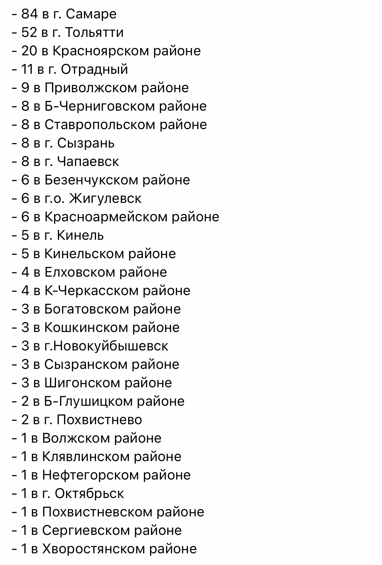 Больше всего заражённых медики выявили в областном центре (84), Тольятти (52) и Красноярском районе (20). Меньше всего (по одному заболевшему) - в шести районах губернии и Октябрьске.