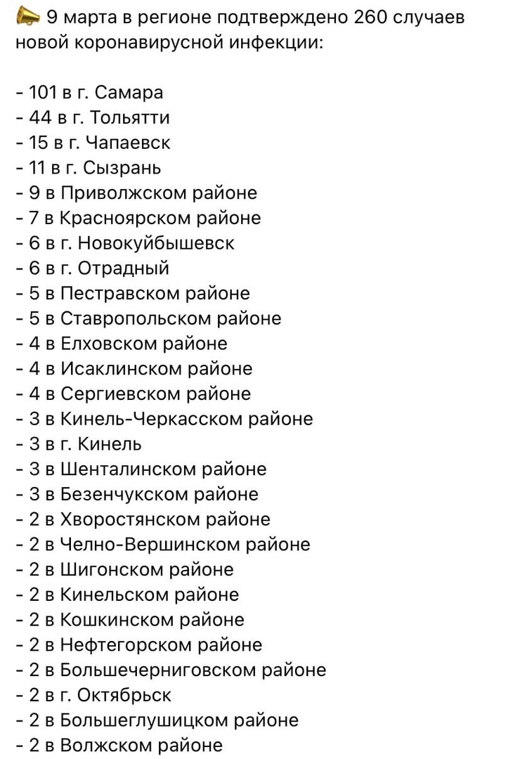 Больше всего зараженных найдено в Самаре (101), меньше всего - в Жигулевске, Богатовском, Борском, Красноармейском, Сызранском, Клявлинском, Камышлинском районах (по одному).