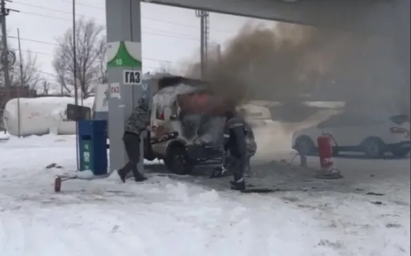 ЧП произошло на заправке у Стромиловского кольца между Самарой и Новокуйбышевском. На кадрах видно, что сотрудники АЗС и другие свидетели произошедшего закидывают машину снегом, а также заливают из огнетушителей.