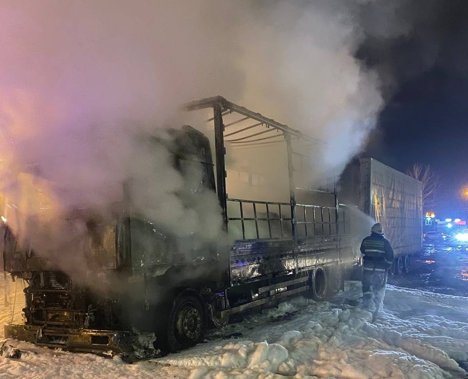 Спасатели получили информацию о возгорании в 0:26. На участке федеральной трассы вспыхнула фура DAF. Сохранялась угроза распространения огня на прицеп.