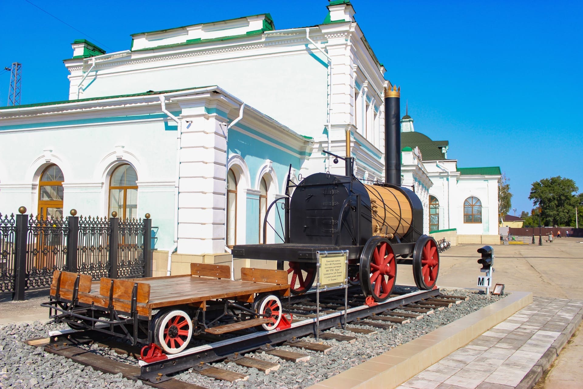 Паровоз изготовили в самарском ремонтном депо. Мастера собирали его в течение четырех месяцев по сохранившимся чертежам. Теперь он встречает и провожает своих железных "потомков" - современные тепловозы, тянущие железнодорожные составы. Рядом с ним - семафор и старинный указатель "Москва-Самара".