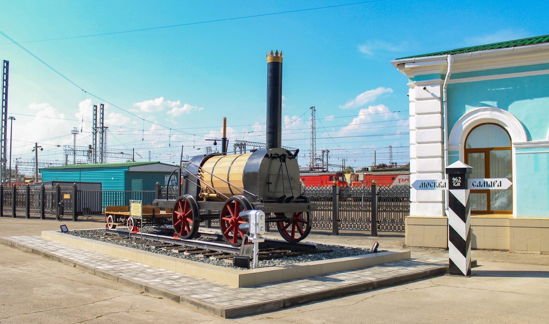 Паровоз изготовили в самарском ремонтном депо. Мастера собирали его в течение четырех месяцев по сохранившимся чертежам. Теперь он встречает и провожает своих железных "потомков" - современные тепловозы, тянущие железнодорожные составы. Рядом с ним - семафор и старинный указатель "Москва-Самара".