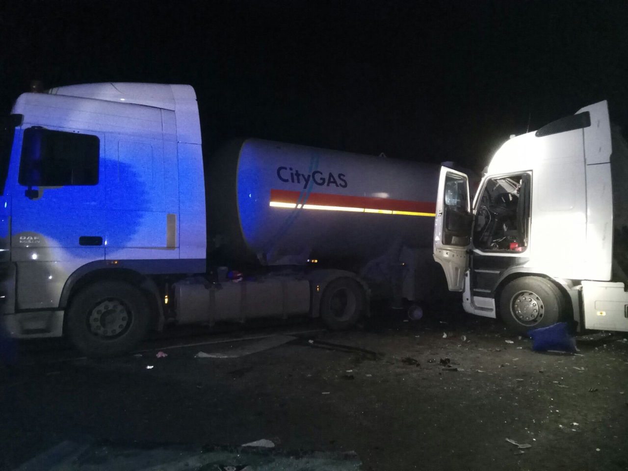 На месте аварии также работают сотрудники полиции, они выясняют все детали случившегося. Причина столкновения большегрузов пока не известна.