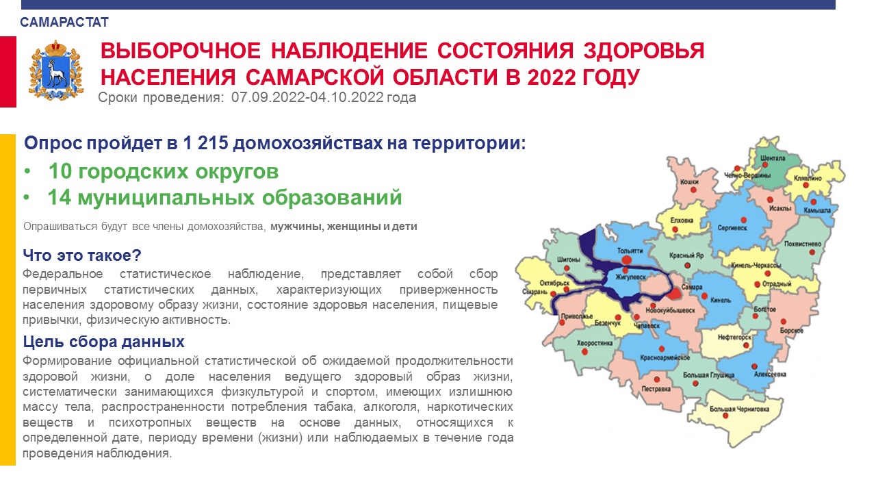 В 63-м регионе стартовал выборочный опрос населения о состоянии здоровья. Он пройдет с 7 сентября по 4 октября. За это время интервьюеры посетят 1 215 квартир и частных домов в городах и селах. Опрашивать будут всех членов домохозяйств - мужчин, женщин и детей. Планируется собрать данные о состоянии здоровья, пищевых привычках, физической активности и приверженности населения к здоровому образу жизни. На основании итогов опроса будет сформирована картина об общем состоянии здоровья жителей Самарской области.