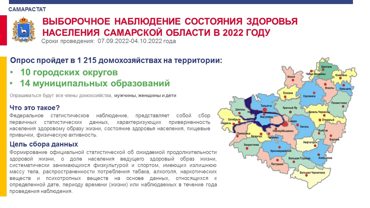 В 63-м регионе стартовал выборочный опрос населения о состоянии здоровья. Он пройдет с 7 сентября по 4 октября. За это время интервьюеры посетят 1 215 квартир и частных домов в городах и селах. Опрашивать будут всех членов домохозяйств - мужчин, женщин и детей. Планируется собрать данные о состоянии здоровья, пищевых привычках, физической активности и приверженности населения к здоровому образу жизни. На основании итогов опроса будет сформирована картина об общем состоянии здоровья жителей Самарской области.
