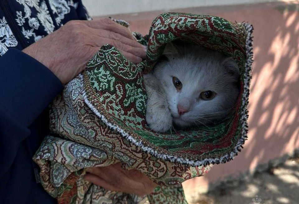 По автолестнице один из сотрудников поднялся наверх и взял кота на руки. После спуска на землю местные жительницы укутали кота в покрывало.