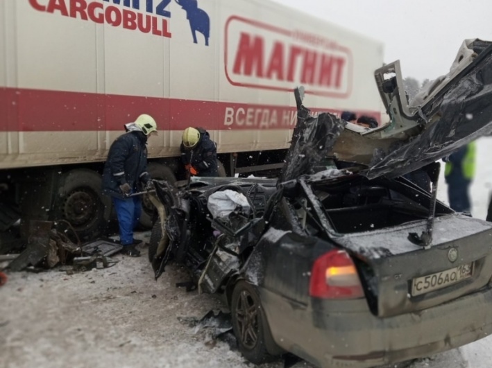 Сегодня, 4 декабря, на трассе М5 в Ставропольском районе, у поселка Винтай произошла крупная авария. Автомобиль "Шкода" влетел на скорости в грузовик MAN.