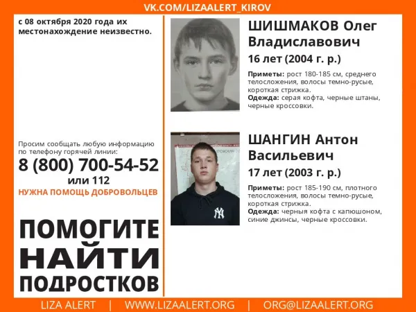 16-летний Олег Ш. и 17-летний Антон Ш. пропали в городе Сосновка Вятскополянского района Кировской области.