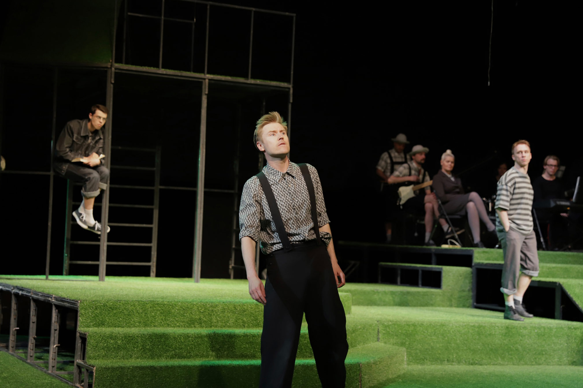 Захватывающее зрителя ощущение чего-то знакомого и подзабытого создается не в последнюю очередь за счет живой музыки на сцене. А чтобы разбавить сантименты, режиссер выводит пятилетних героев-карапузов смешными дядьками в коротких штанишках. Антон (Алексей Архипов) и Юрик (Александр Петров) периодически выступают с логическим анализом детских считалок, сыплют при этом научными терминами и становятся поводом для остроумного диалога про театральную условность: