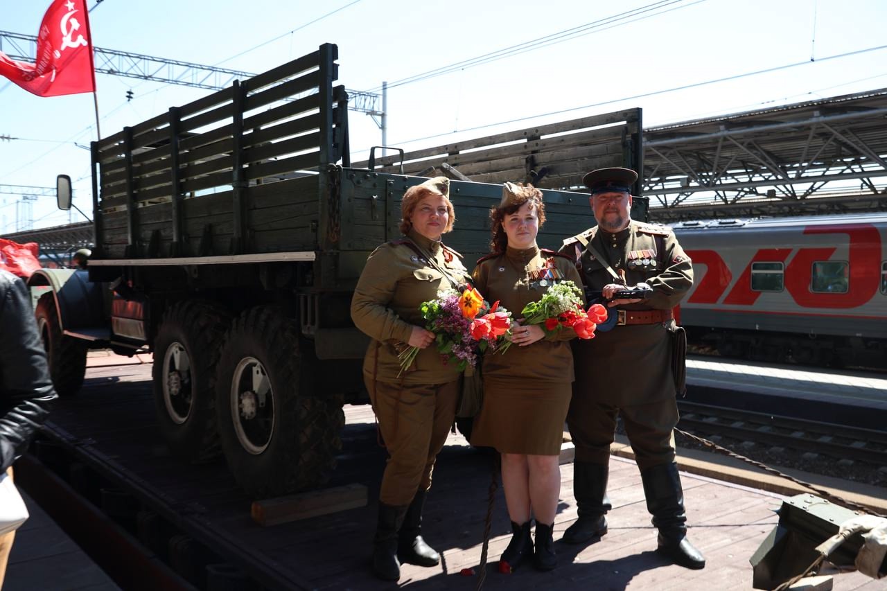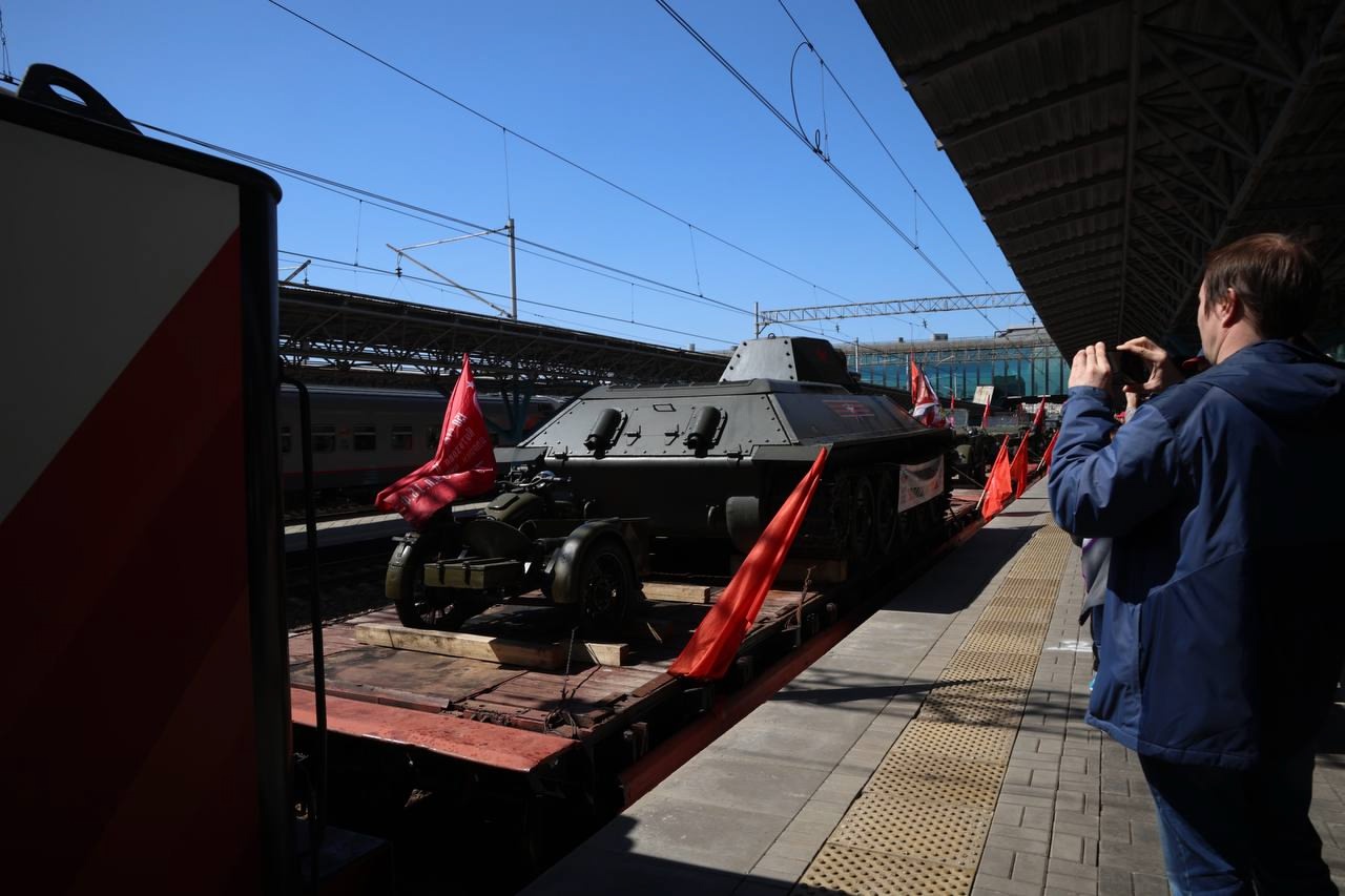 Это 9 платформ с военной техникой, на которых разместили уникальные экспонаты, в том числе автомобиль-амфибию. Во главе - легендарный паровоз "Лебедянка". Также в состав эшелона вошли пассажирские вагоны "Бессмертного полка", а сотрудники поезда одеты в форму времен ВОВ.