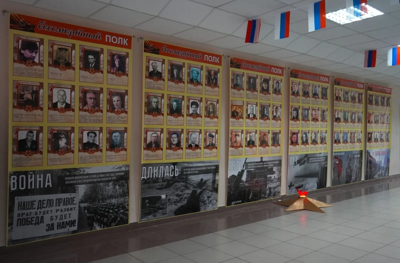 В числе активных участников - тольяттинская школа имени С. П. Королева. В холлах ее обоих корпусов сейчас расположены такие памятные стены с фотографиями героев ВОВ. Рядом с ними во время торжественных мероприятий устанавливают искусственный Вечный огонь, где учащиеся кадетских классов несут почетный караул.
