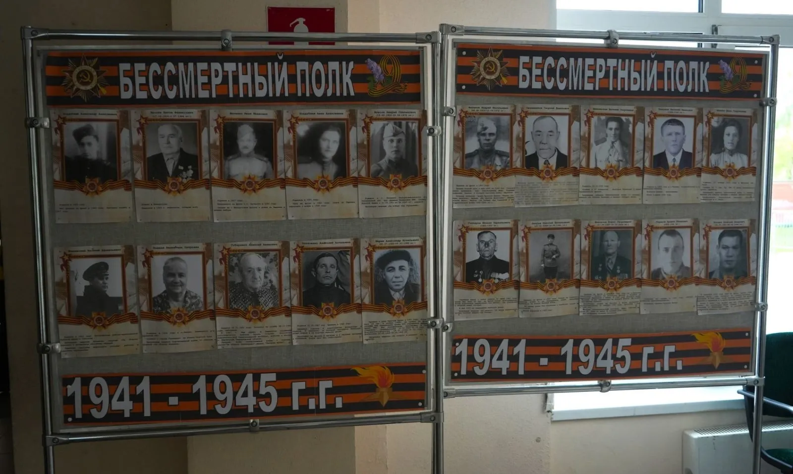 Один из форматов "Бессмертного полка", введенный в России в этом году, - "Стена памяти". Она представлена стендами с портретами и биографией участников Великой Отечественной войны и специальной военной операции.