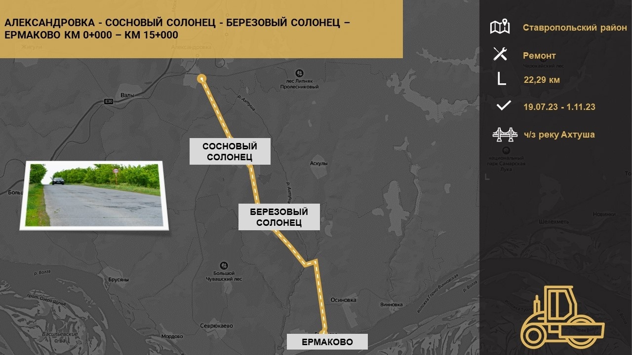 Позже здесь уложат верхний слой дороги, укрепят обочины, установят барьерное ограждение, заменят павильоны на автобусных остановках и обустроят около них тротуары. Кроме того, на участке дороги появятся новые дорожные знаки и разметка. Контракт включает в себя и ремонт моста через реку Ахтуша.