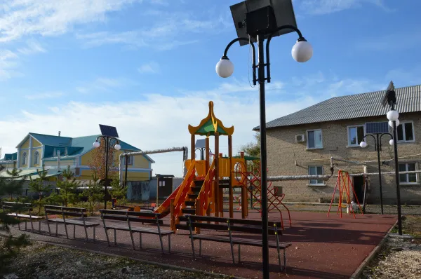 Теперь на этом месте установлены качели, карусели и горки в ярком современном оформлении. Игровая площадка оснащена искусственным покрытием и проведено освещение.