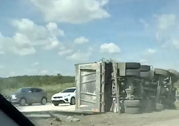 Очевидцы поделились кадрами перевёрнутого КамАЗа.