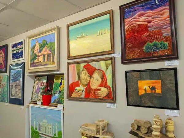 Картины сделаны в различных техниках - живопись (маслом, акварелью), энкаустика, акватипия, графика, батик и гобелен. Представлено и ювелирное искусство.