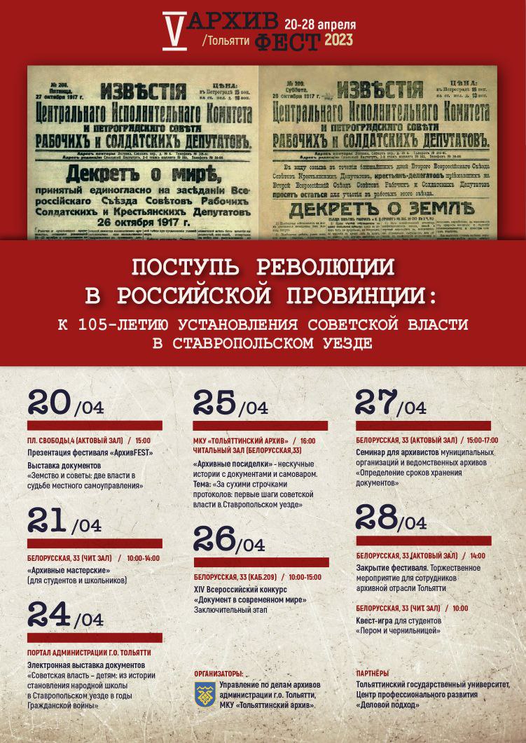 Событие посвящено 105-летию установления советской власти в Ставропольском уезде. Организаторы фестиваля - Управление по делам архивов администрации городского округа Тольятти и МКУ "Тольяттинский архив".
